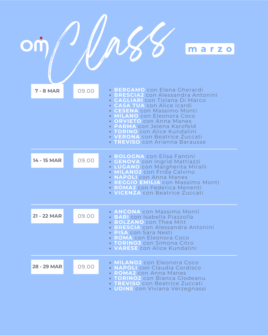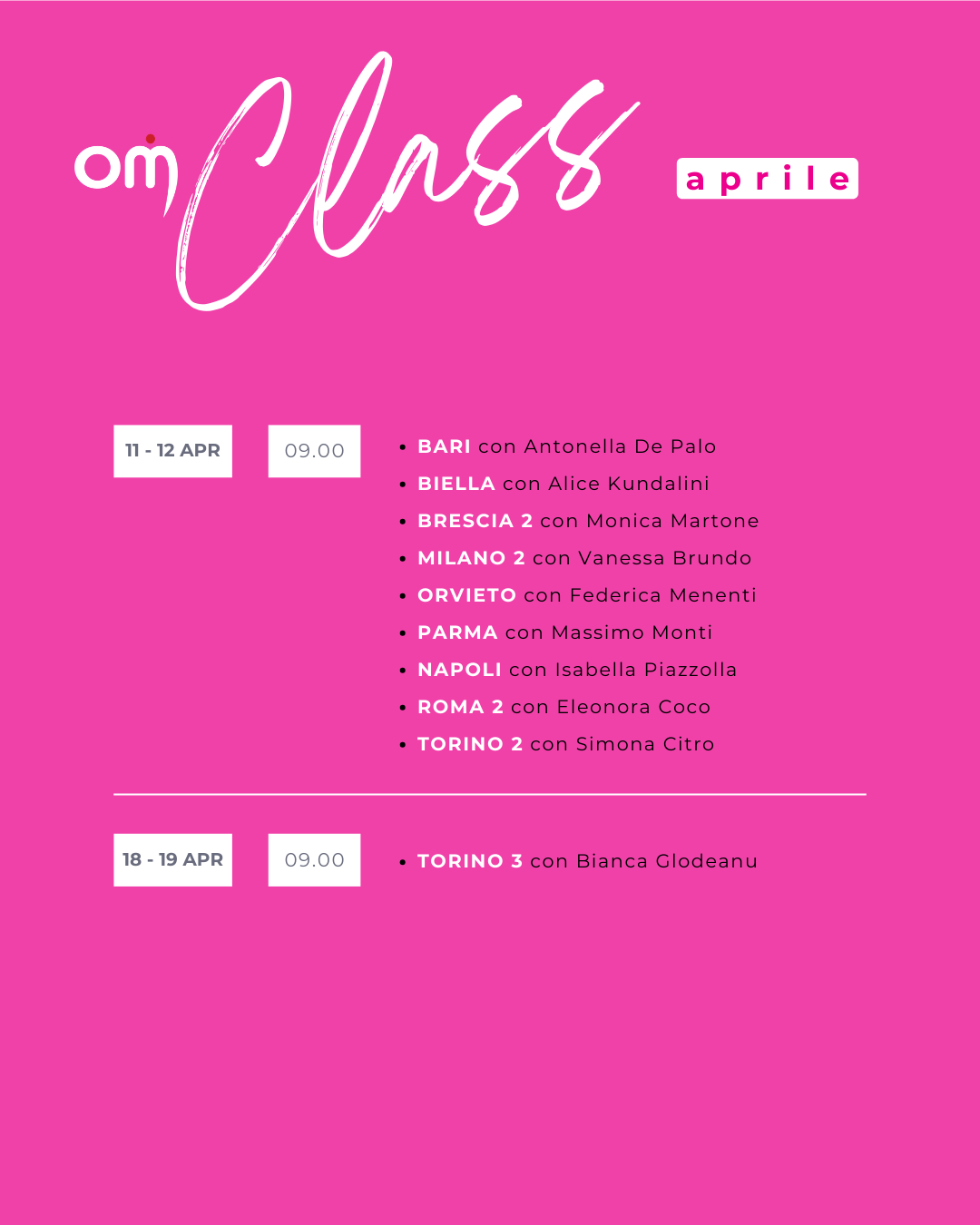 Le classi si svolgono sia sabato che domenica mattina dalle 9.00 alle 10.30.
